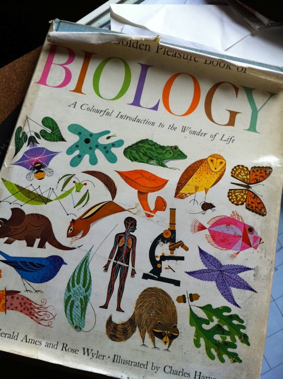 Last month Michael found Charley Harper’s Golden Book of BIOLOGY. According to the inscription inside it’s a copy someone won as 1st prize for something in Gonzaga College back in 1964. It has that old book smell and the dust jacket is scruffy, but this is a classic from an extraordinary illustrator. It is considered by many to be: