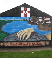 The end of every row of houses in this Unionist estate are painted. You can see how imposing the murals are – look how tiny Michael is beside that hand. The hand turns up on everything, including Belfast beer!