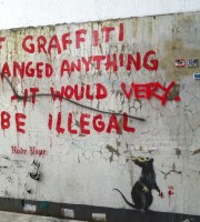 Then we noticed there was perspex protecting the piece. Which is kinda ironic, given the message – ‘IF GRAFFITI CHANGED ANYTHING -IT WOULD BE ILLEGAL’. The image – which apparently appeared in Fitzrovia in 2011– has attracted further graffiti, including the badly placed ‘VERY.’ and a sarcastic exchange about said perspex.