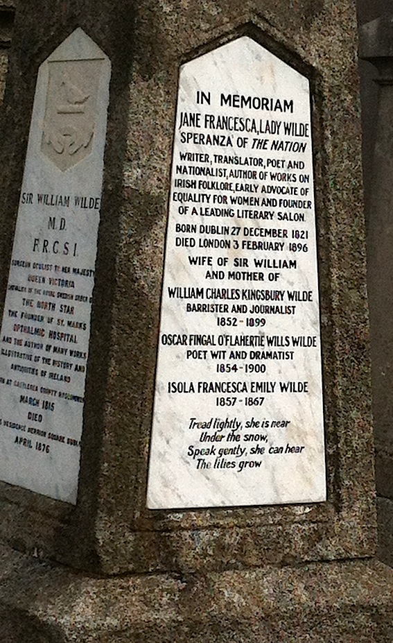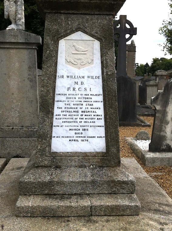 William Wilde was knighted in 1864 but he had a rather spectacular fall from grace shortly afterwards. A former patient accused him of seducing her and it was the talk of Dublin. He would already have been gossiped about as he had three children from relationships prior to his marriage – all of whom he acknowledged and supported. This is his grave, which we spotted recently in Mt Jerome Cemetery in Dublin.