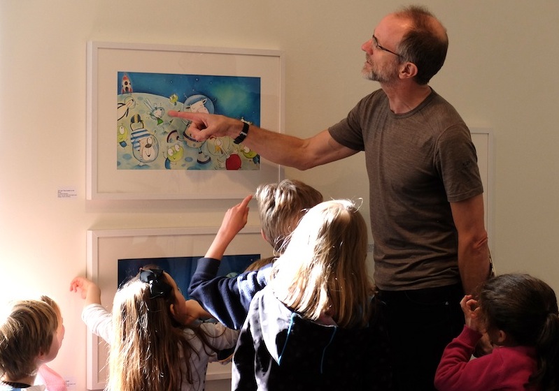 DSCF0370 Published November 2, 2014 at 799 × 560 in A Guided Tour of Pictiúr Here Michael is asking the kids to check out how Niamh Sharkey has drawn her cow, hen and rabbit – animals which appear in several of the images in the show.