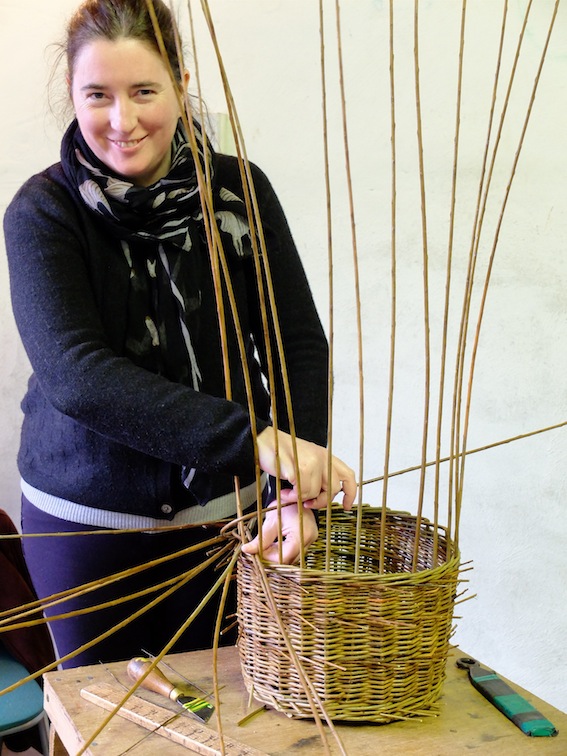 DSCF1254 Published March 3, 2015 at 567 × 756 in Basket Case Anna is weaving a rim – bending down the uprights to weave it.