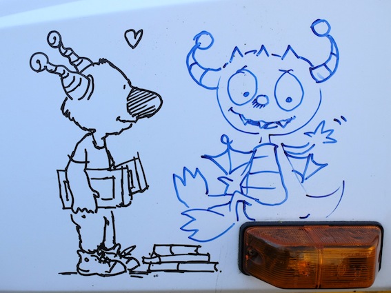 DSCF1786 Published April 30, 2015 at 567 × 425 in @ the Castle Michael’s Gatto falls for a Hugglemonster (drawn by Norton)