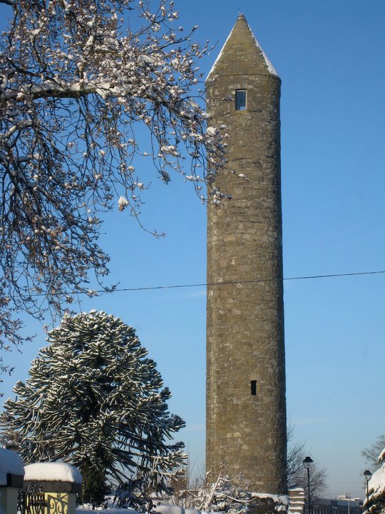 So, what were Round Towers for? In 1830 the Royal Irish Academy held a competition for scholarly essays on the subject and it raised some whacky theories. There was a strong belief that the towers were places of fire worship for the Phoenicians (!) and the 2nd prize went to an essay which suggested the towers were ‘pagodas for phallic worship, erected by Zoroastrian refugees from Persia’!! The main prize was awarded to George Petrie for his essay arguing that since Round Towers were found near the remains of churches and known monastic settlements they were therefore part of mediaeval Christian culture. This didn’t stop someone in 1834 suggesting that the towers didn’t actually exist at all, an argument refuted by another gent who said he could verify the existence of the Clondalkin tower, at least. He’d ‘tested (it) against all five of his senses, including taste; he’d licked it.’ He found it slightly soapy. Perhaps, he suggested, this was a result of it being greased, to assist competitors who ‘scaled it in order to win a hat or bandana suspended from the top window by a druid’. (NB: info in this para is pretty much cogged from Ireland’s Round Towers, Tadhg O’Keefe, Tempus, 2004)