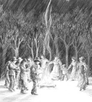 A small number of Choctaw and Chickasaw families gathered in a clearing in the woods. We ate cornbread and chicken, and dumplings in grape juice. A fire cackled in the middle of the circle and the women and girls sat to the right of it, men and boys to the left. Gary, drumming on an Irish bodhrán, walked into the centre to call the dances. The men formed a line behind him. As they approached our side of the circle the women rose and threaded themselves between the men.