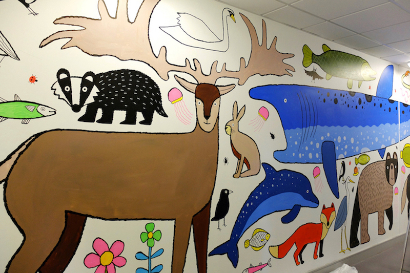 C8 Published February 15, 2018 at 800 × 533 in Murals with PJ Lynch As much of the mural as I could get in! Chris tackled the largest wall, began on the wall last and finished on Sunday afternoon! It looks fab, great strong fun images for a slightly dark corridor.